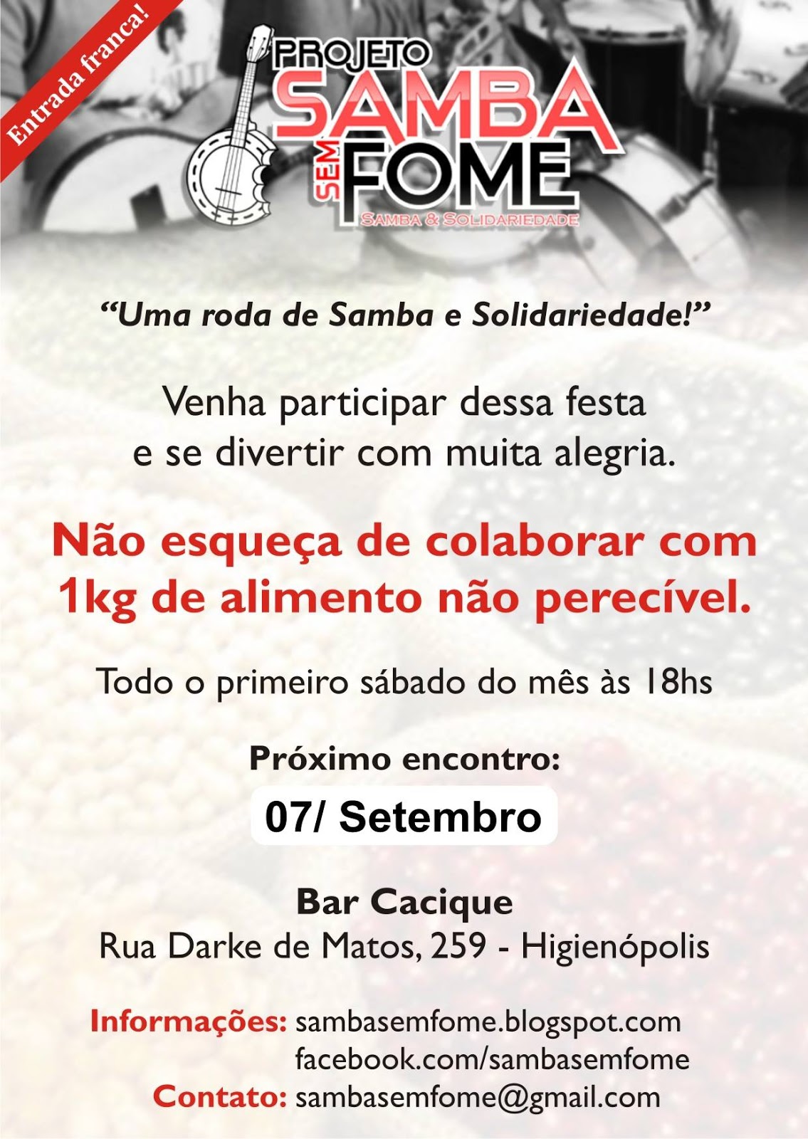 Tomando como exemplo um evento que existia em Piedade, resolveram elaborar uma Roda de Samba para reunir os amigos, curtir um bom Samba e, por que não, ajudar quem precisa? Surgiu então a primeira versão do Samba Sem Fome! Começou no Méier, na Casa Branca, com apoio do nosso amigo Júnior Peçanha. Passou por Higienópis, Quintino..., mas de forma esporádica, um encontro aqui outro ali..., até que, parou!